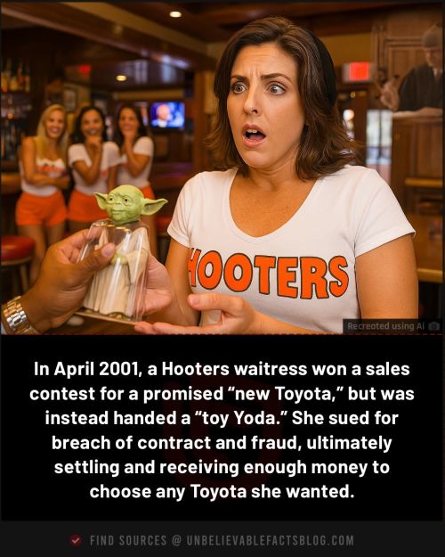 Hooters offered employees the chance to win a Toyota. When the winning waitress was given a “toy Yoda” action figure as a prank she sued and won enough to “pick out whatever type of Toyota she wants.”