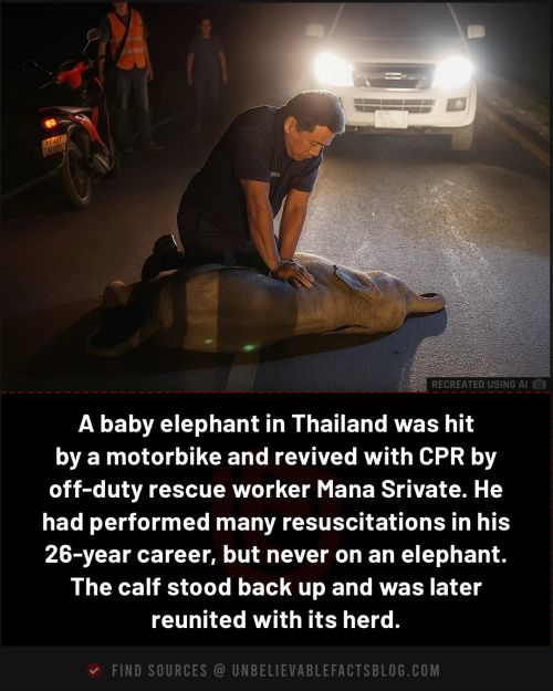 A baby elephant in Thailand was hit by a motorbike and revived with CPR by off-duty rescue worker Mana Srivate. He had performed many resuscitations in his 26-year career, but never on an elephant. The calf stood back up and was later reunited with its herd.