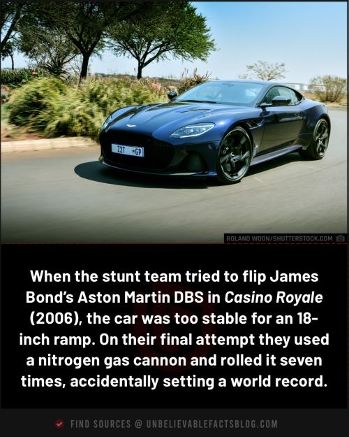 During filming for Casino Royale in 2005, they had trouble getting the Aston Martin DBS to roll over, because the car was too stable. They ended up using a gas cannon. It worked better than expected, rolling the car seven times, which was a new world record.