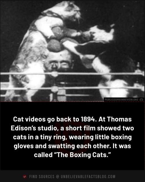 Cat videos date back to 1894, when Thomas Edison filmed two cats “boxing.” The cats were wearing tiny boxing gloves and swatting at each other in a miniature ring.