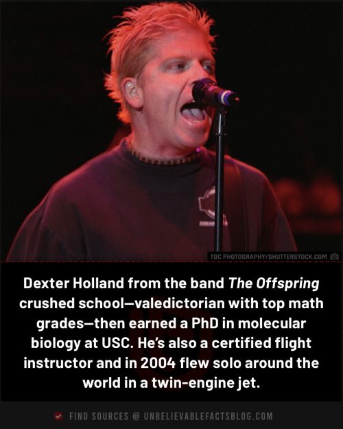 Musician Dexter Holland, from the band The Offspring, had the best math grades in his high school class, graduated as valedictorian, and has a PHD in molecular biology. He’s also a certified flight instructor and once flew solo around the world.