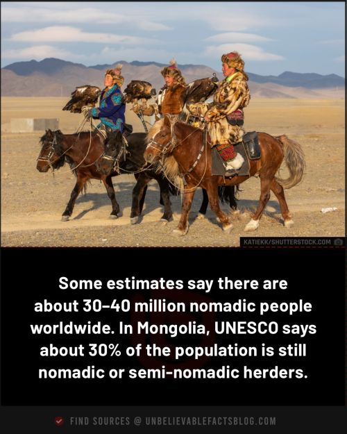 Some estimates say there are about 30–40 million nomadic people worldwide. In Mongolia, UNESCO says about 30% of the population is still nomadic or semi-nomadic herders.