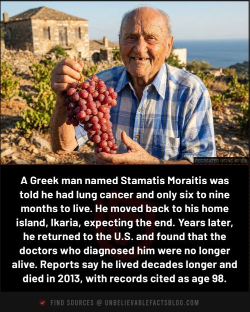 A Greek man named Stamatis Moraitis was told he had lung cancer and only six to nine months to live. He moved back to his home island, Ikaria, expecting the end. Years later, he returned to the U.S. and found that the doctors who diagnosed him were no longer alive. Reports say he lived decades longer and died in 2013, with records cited as age 98.