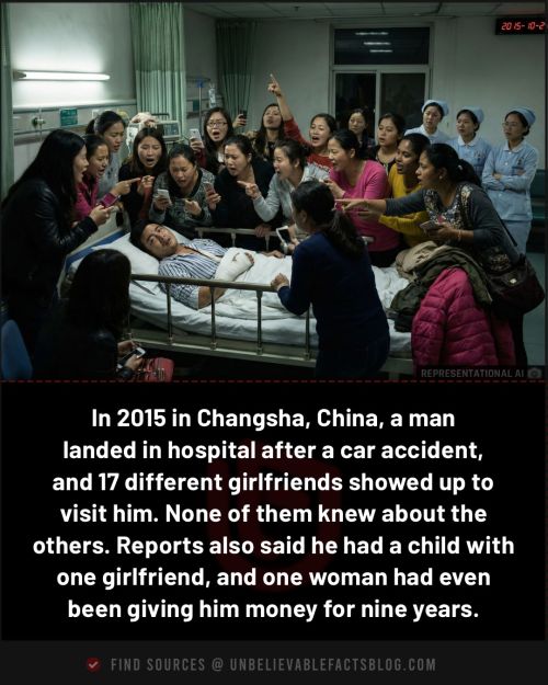 In 2015 in Changsha, China, a man landed in hospital after a car accident, and 17 different girlfriends showed up to visit him. None of them knew about the others. Reports also said he had a child with one girlfriend, and one woman had even been giving him money for nine years.