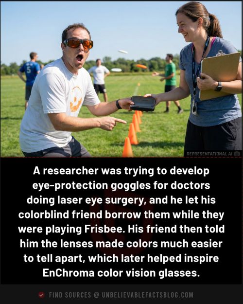 A researcher who was trying to develop eye-protection goggles for doctors doing laser eye surgery. He let his friend borrow them while playing frisbee, and his friend informed him that they cured his colorblindness.