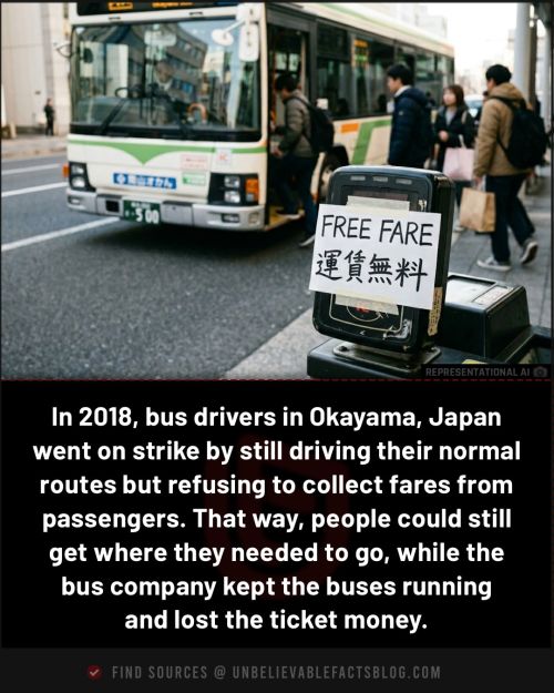 In 2018, bus drivers in Okayama, Japan went on strike by still driving their normal routes but refusing to collect fares from passengers. That way, people could still get where they needed to go, while the bus company kept the buses running and lost the ticket money.
