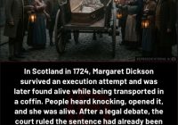 unbfacts: In Scotland in 1724, Margaret Dickson survived an execution attempt and was later found alive while being transported in a coffin. People heard knocking, opened it, and she was alive. After a legal debate, the court ruled the sentence had already been carried out, so she could not be tried again. She became known… Read More »