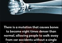 unbfacts: There is a mutation that causes bones to become 8 times denser than normal that allow people to walk away from car accidents without a single fracture but with a trade-off of being unable to swim. Source