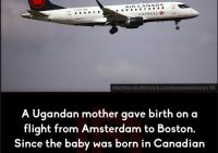 unbfacts: During a flight from Amsterdam to Boston, a woman from Uganda gave birth to a child. Because they happened to be in Canadian airspace at the time, the baby was processed as a Canadian citizen. Source
