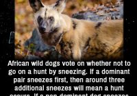 unbfacts: African Wild Dogs vote on whether not to go on a hunt by sneezing. If a dominant pair sneezes first, then around three additional sneezes will mean a hunt occurs. If a non-dominant dog sneezes first, then it typically takes 10 additional sneezes to sway the group to hunt. Source